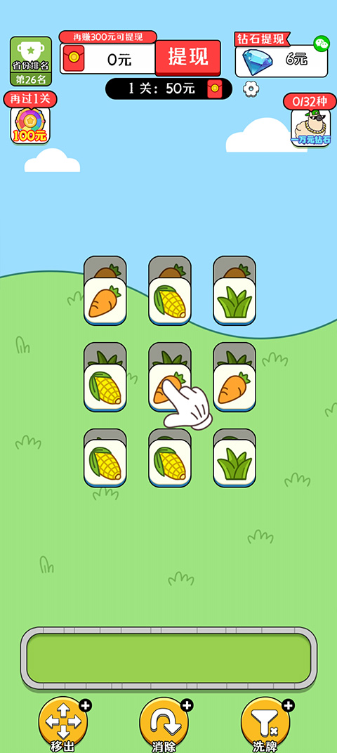 2、进入主界面后,游戏规则与“羊了个羊”一致:第一关极为简单,只需连续点击三个相同图案即可完成消除。