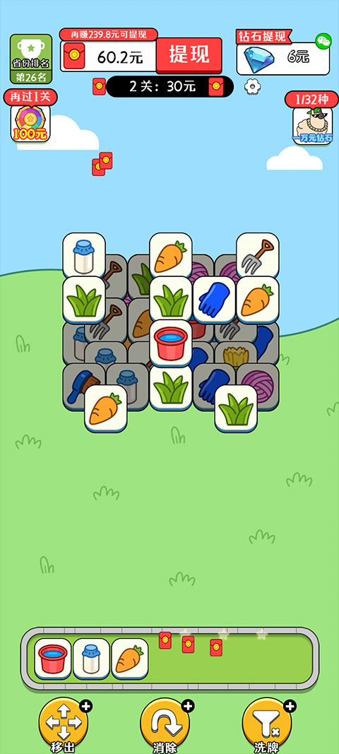 欢乐农场旧版是一款融合休闲消除与红包激励机制的趣味手游。其核心玩法与热门游戏“羊了个羊”高度相似——玩家需点击三个相同图案的卡牌进行消除,随着关卡推进,难度会陡然提升。但与同类游戏不同的是,欢乐农场旧版在每次成功消除后都会发放红包奖励,通关后还可参与幸运转盘抽奖,福利层层叠加。游戏支持微信一键登录,无需繁琐注册,点开即玩;同时提供多样化的红包获取渠道,包括闯关、邀请好友、每日签到等,真正实现边玩边赚。