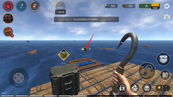 4、发现漂浮物资时,点击使用钩子将其拉至木筏;