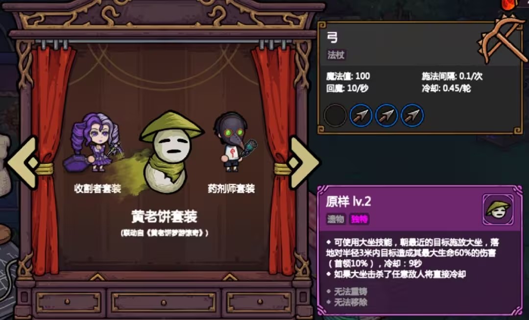 9. 黄老饼套装 集齐6套其他套装后自动解锁,配备【弓】与3枚【黄老饼的箭头】。升级扩大【大坐】伤害范围并减少冷却。其位移机制便于脱战或拾取特殊宝箱,而【大坐】的百分比伤害对高血量敌人(尤其是隐藏BOSS)极具威胁,适合进阶玩家使用。